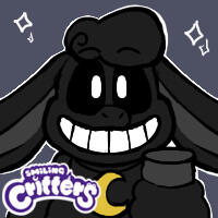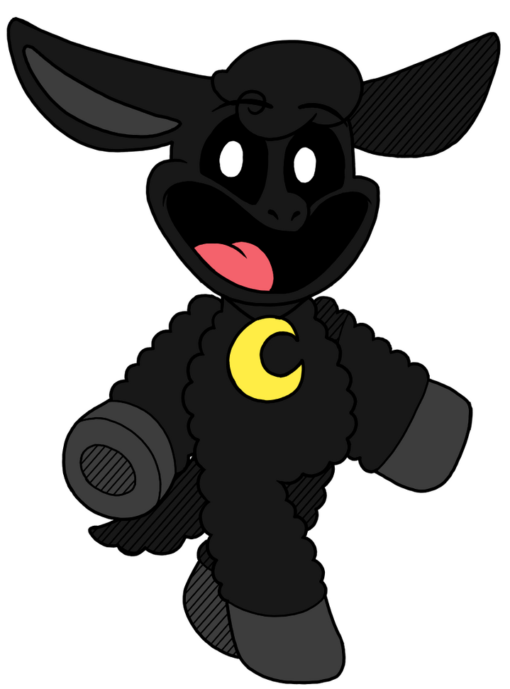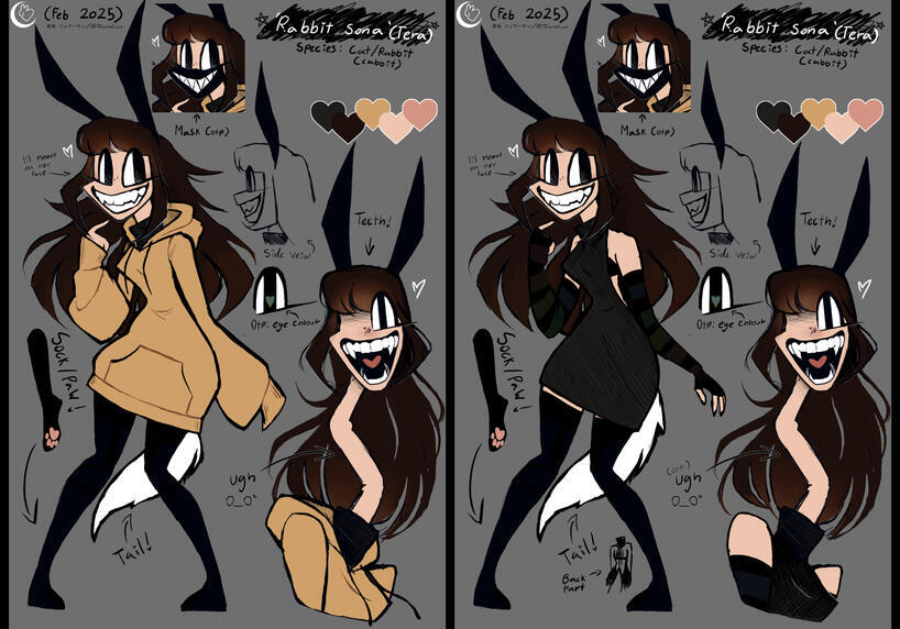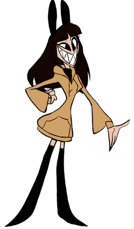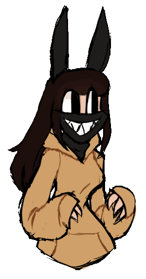 Their main visual form Appears to be a 2D humanoid being that has very cartoony anatomy, Similar to the Vivzipop artstyle curse. her facial features appears to have wide, oval eyes with cat-like pupils, and her mouth sometimes stretches out that shows nothing but white, rabbit-like teeth and canines on the sides. While The rest of appears has long dark brunette hair with black rabbit-like ears on top, oversized yellow-y beige hoodie on top a black turtle neck sweater and a stripy black-and-dark-rainbow fingerless gloves, along with a white cat tail and a pair of black thigh-high socks with cat paws underneath.