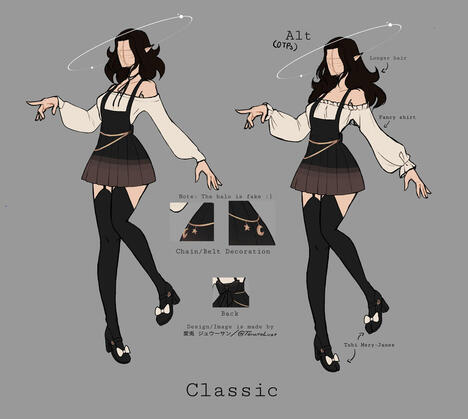 She's wearing a small gold chain (with a small golden moon and stars) attached to a black skirt overalls on top of a white/cream-coloured sweater that shows both of her shoulders. She has black thigh-high socks and black Tabi Mary Janes that have gold (heart-shaped) buckle and a white bow tie attach to each shoe. Her fake halo has two small white plants on it (one of them has a smaller planet around it) for random aesthetic